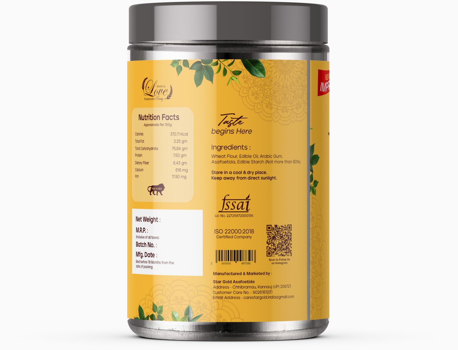 Star Gold Compounded Hing is a premium quality compounded asafoetida powder, specially processed to deliver a strong and rich aroma that enhances the taste of everyday cooking. Manufactured under hygienic conditions, this hing is sun dried and packed in airtight stainless steel containers to retain freshness and aroma for a longer period.